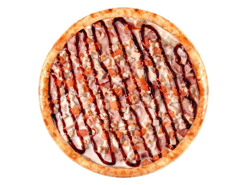 Сливки, моцарелла, ветчина, бекон, куриное филе, помидоры, соус барбекю