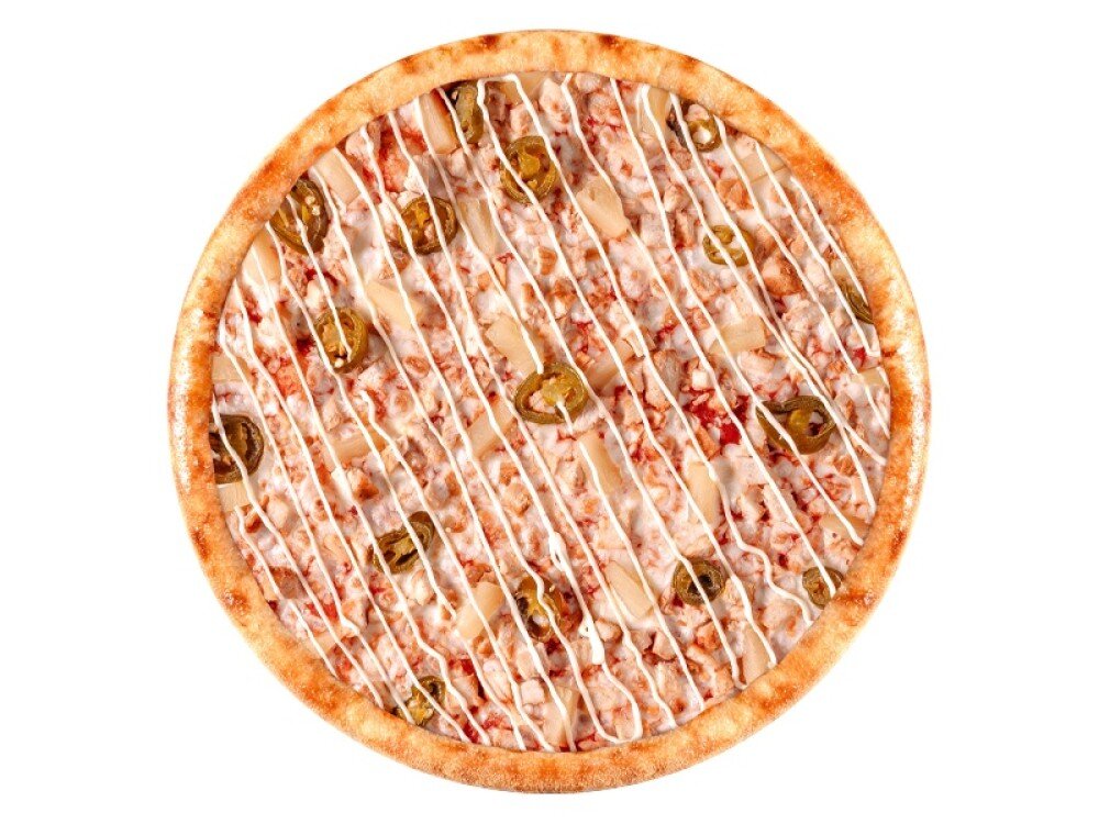 Томатный соус, моцарелла, куриное филе, ананас, халапеньо, чесночный соус