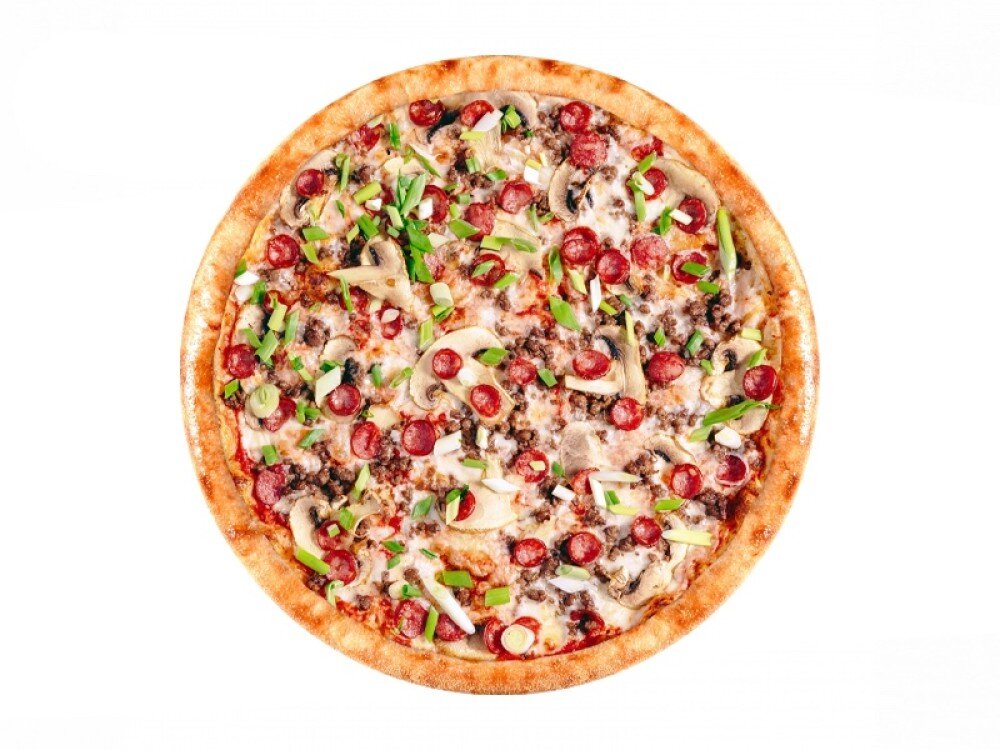 Томатный соус, сыр моцарелла, говядина, колбаски охотничьи, шампиньоны, зеленый лук