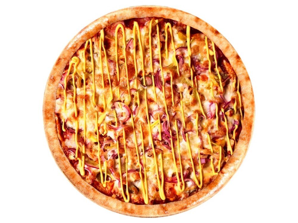 Соус барбекю, соус спайси, бекон, куриное филе, огурцы маринованные, перец сладкий, лук красный, моцарелла, соус сырный