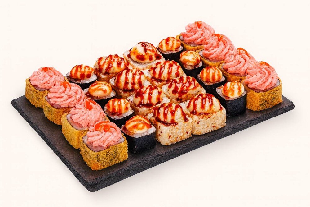1-Запеченный Мини ролл с томаго и фирменным соусом. Полит Унаги 2-Сыр,курочка и помидор.Кунжут. Запеченный под сырным соусом. Унаги 3-Жаренный с крабом и огурцом. Икорный соус и Чили