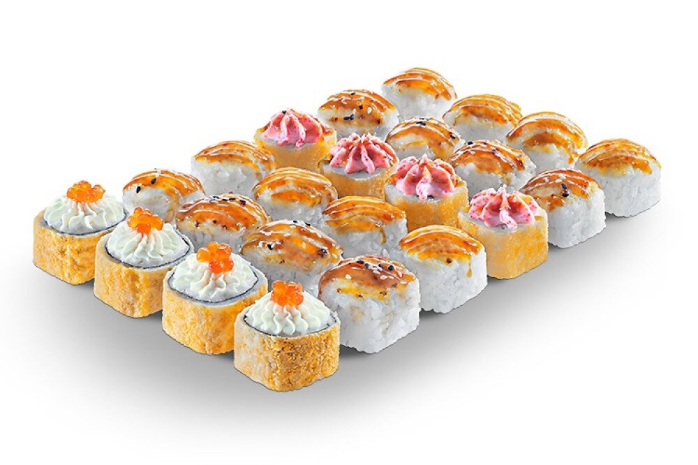 4шт -снежный краб,лосось.Шапочка сыра и икра.4шт-темпурная креветка,сыр.Икорный соус и Унаги.Запеченный 8шт-Сыр,курица,бекон и помидор.Шапочка спайси,унаги и кунжута.Запеченный 8шт-сыр,креветка,лосось,огурец.Спайси,унаги и кунжут