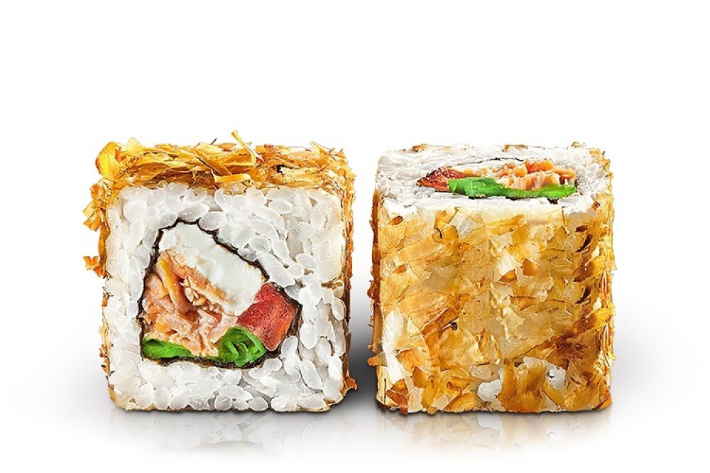 Обжариваем лосось в соусе Терияки,добавляем томат,пекинскую капусту и нежный сыр. И обваливаем в стружке тунца. Идеально