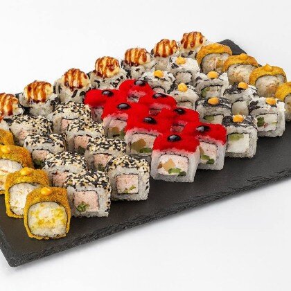 1-Запечённый мини-ролл с Томаго и помидором. Чесночный соус и соус унаги
