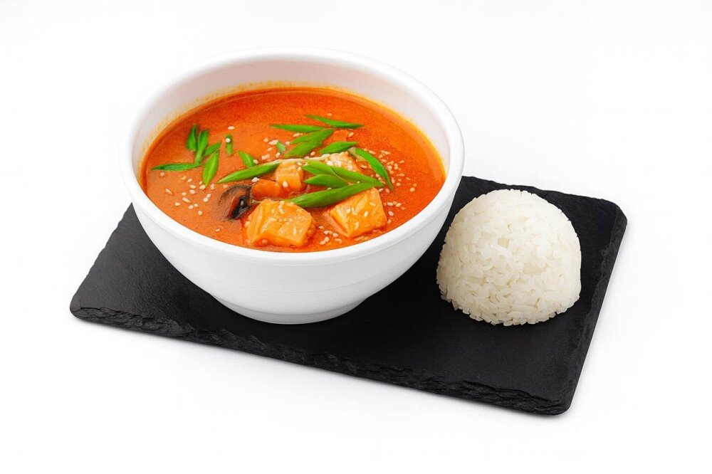 Кокосовое молоко, шампиньон, лосось, лук зелёный, паста том ям, паста кимчи, мирин, корень имбиря, лимон, перец чили. Рис подается отдельно