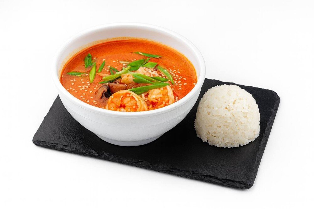 Кокосовое молоко,креветки,паста Том Ям,Ким Чи, шампиньоны,зеленый лук, перец Чили. Рис подается отдельно.