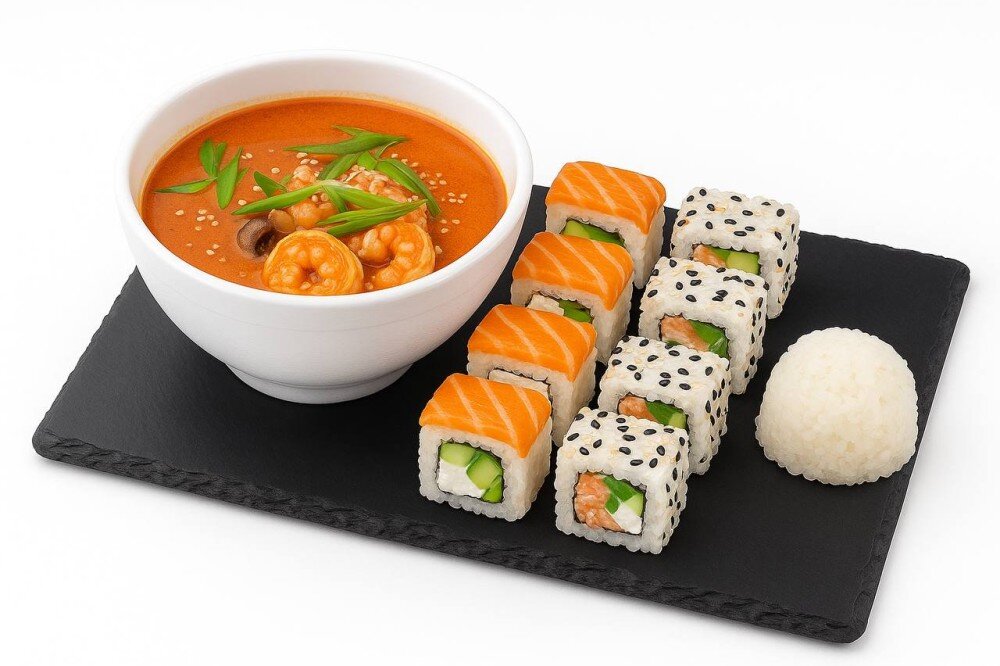 Том Ям с креветками. Филадельфия и Калифорния по 4 кусочка