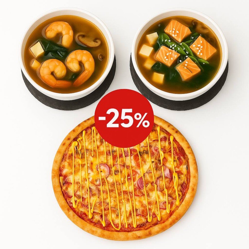 Суп мисо с лососем. Мисо с креветкой и пицца Чизбургер 28см