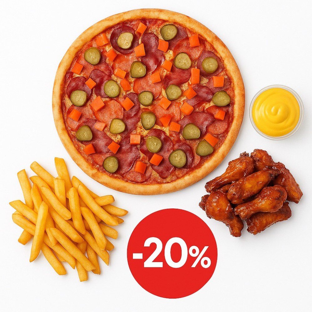 Мясная пицца 28см. Фри 100гр. Сырный соус и крылышки 5шт.