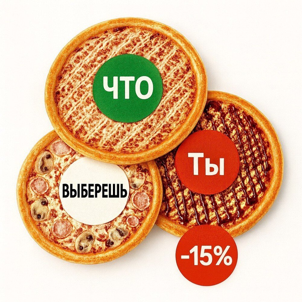 Решай сам и напиши в комментариях к заказу! На выбор 3 пиццы по 28см: Пепперони,Ветчина и грыбы,4 сезона,Жульен,Карбонара,Чикен ранч или Мега бекон