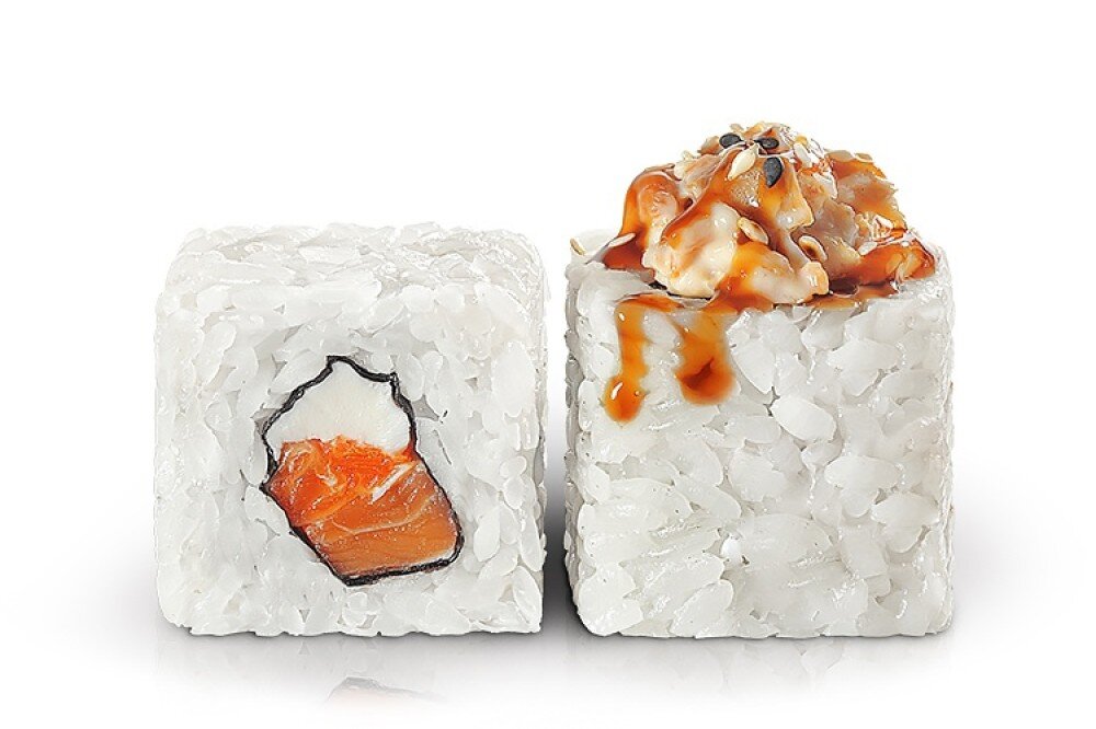 Ролл с нежным сыром и Атлантическим лососем. Шапочка сливочно-острая с беконом в соусе Терияки и поливается Унаги соусом. Ролл порадует Вас неподдельным наслаждением, которое поможет Вам развязаться)