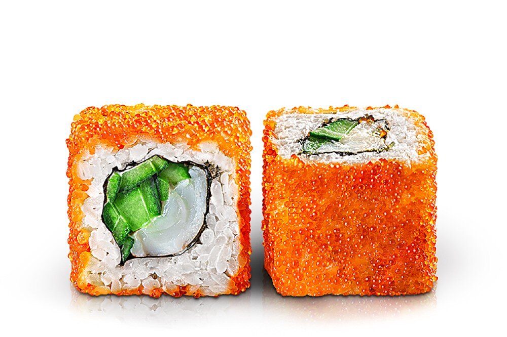 Тигровые креветки, добавляем свежий огурчик. Все это выкладываем на лист нори, заворачиваем, посыпаем икрой масаго. Идеальная Калифорния готова