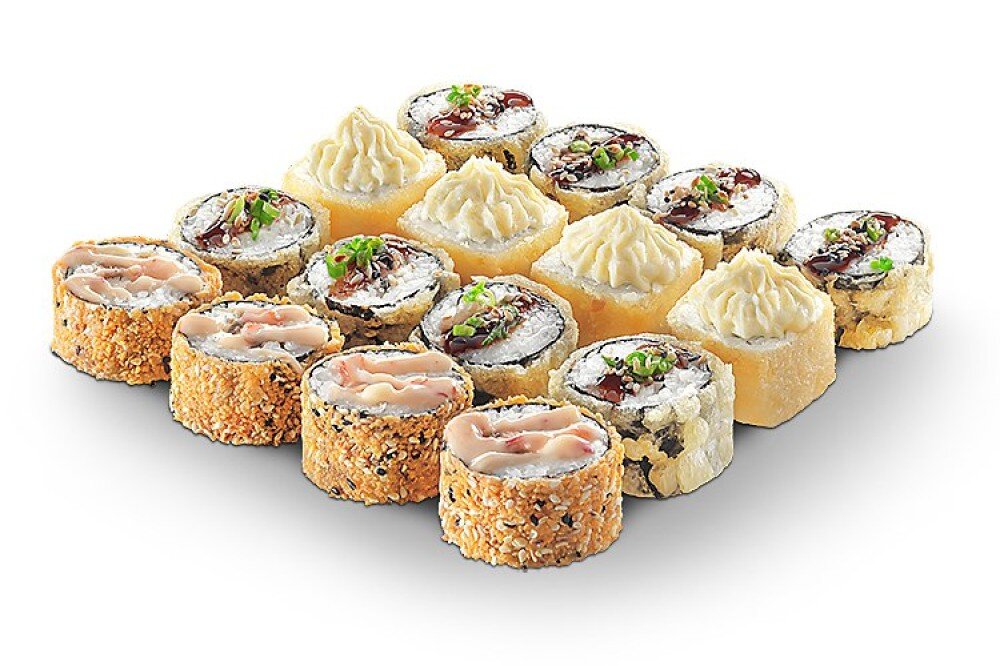 16 жареных кусочков счастья. Состав-нежный сыр Hohland, Атлантический лосось и свежий огурчик.Сверху и полит Унаги соусом. И второй ролл-Снежный краб, Японский Омлет и огурец.Шапочка Фирменного соуса и пикантный соус спайси