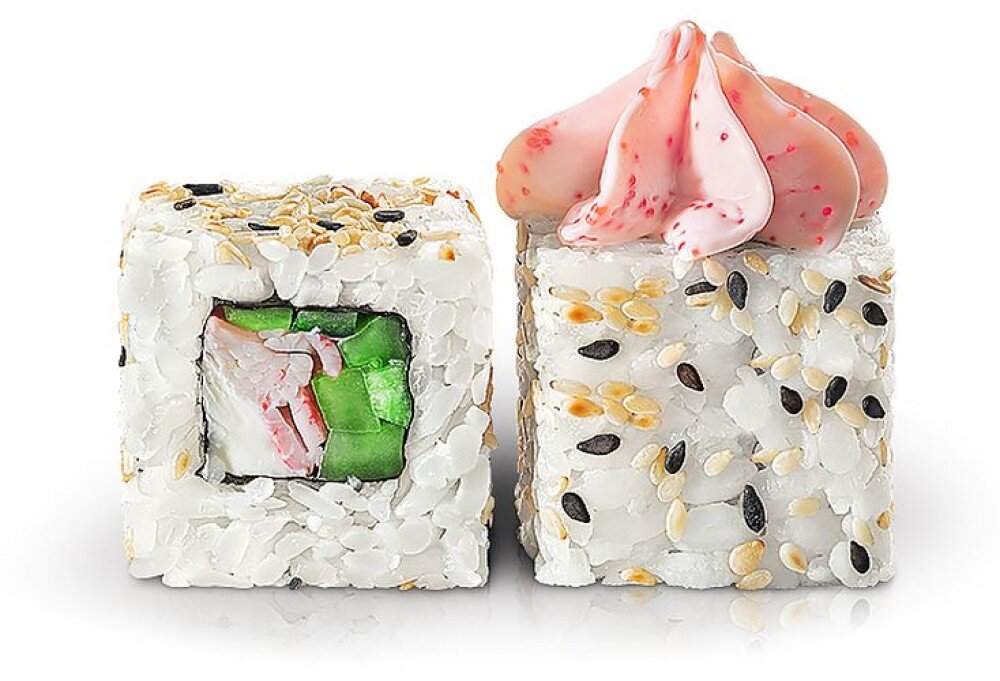 Сливочный сыр,снежный краб,свежий огурчик. Шапочка Икорного соуса,укутан в кунжуте