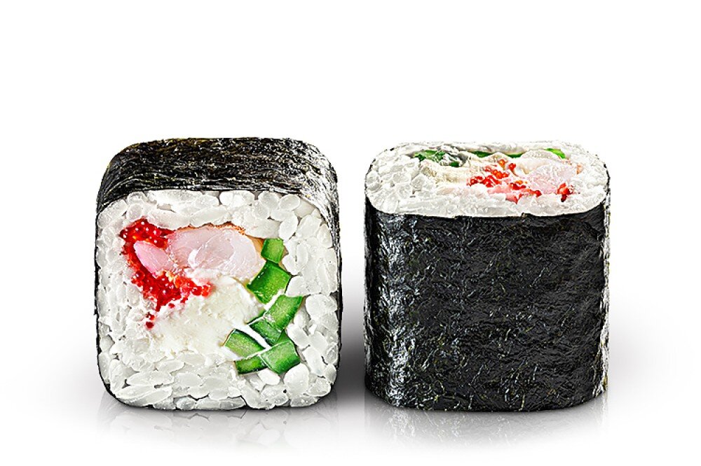 Тигровая креветка, сливочный сыр, икра масаго и хрустящий огурчик.