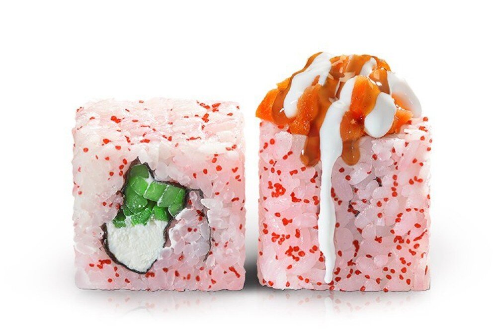 Сыр Hohland, огурец, икра Масаго.Шапочка из лосося со сладким соусом Чили, полит сливочным соусом и Унаги