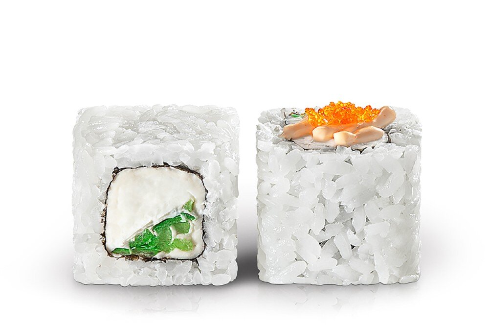 Сливочный сыр,сырный соус и свежий огурчик. Поливаем спайси соусом и посыпаем икрой Масаго