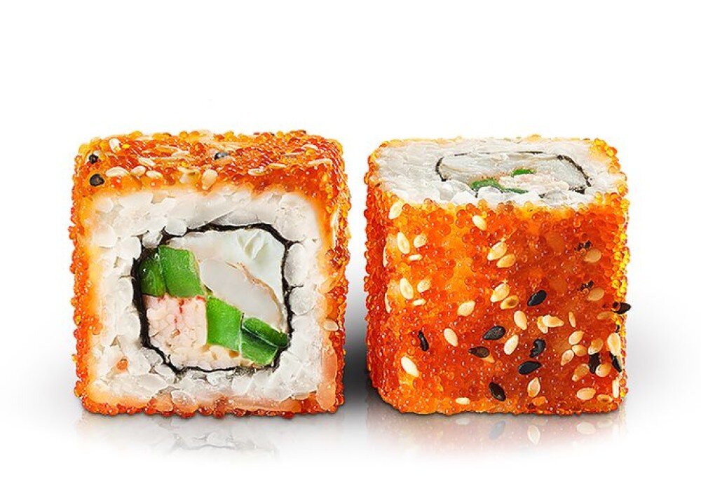 Снежный краб, тигровая креветка, свежий огурчик,чесночный соус-это начинка. Укутываем в икру Масаго и посыпаем жаренным кунжутом
