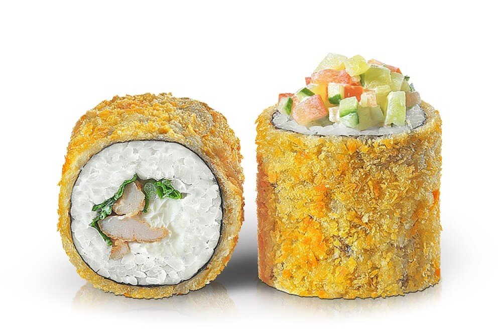 Темпурный ролл с куриным филе, сливочный сыр, салат Айсберг. Шапочка из овощного микса майонеза и спайси соуса