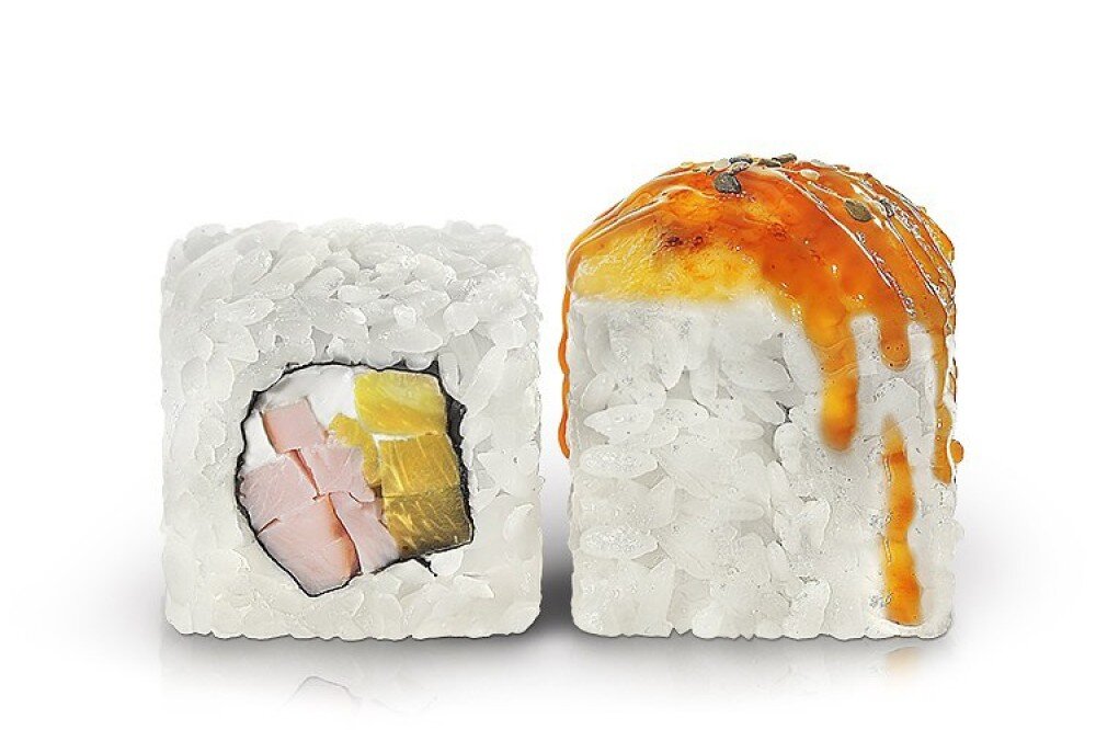 Сливочный сыр, курочка, ананас. Запечённая шапочка сырного соуса, поливается Унаги соусом и кунжутом