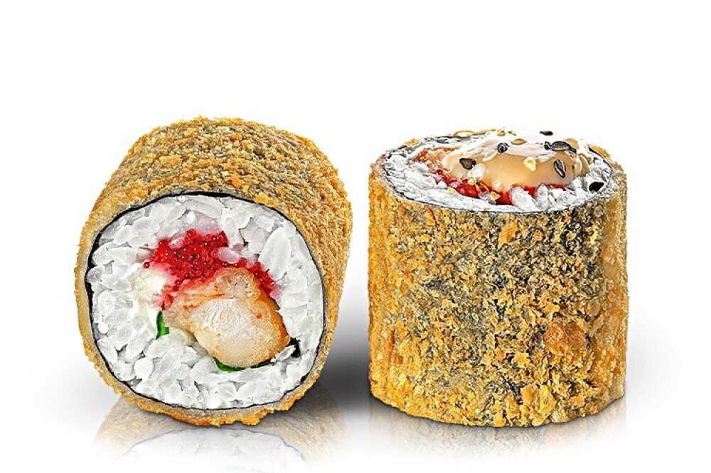 Темпурная тигровая креветка, сливочный сыр, икра масаго, свежий огурчик.Поливается спайси соусом+кунжут