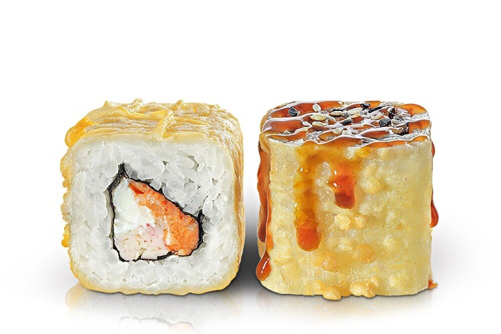Свежий Атлантический лосось, снежный краб и сливочный сыр. Поливается Унаги соусом и кунжутом