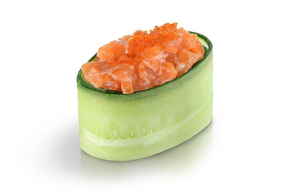 Гункан суши. Лосось,рис, огурец, икра Масаго.